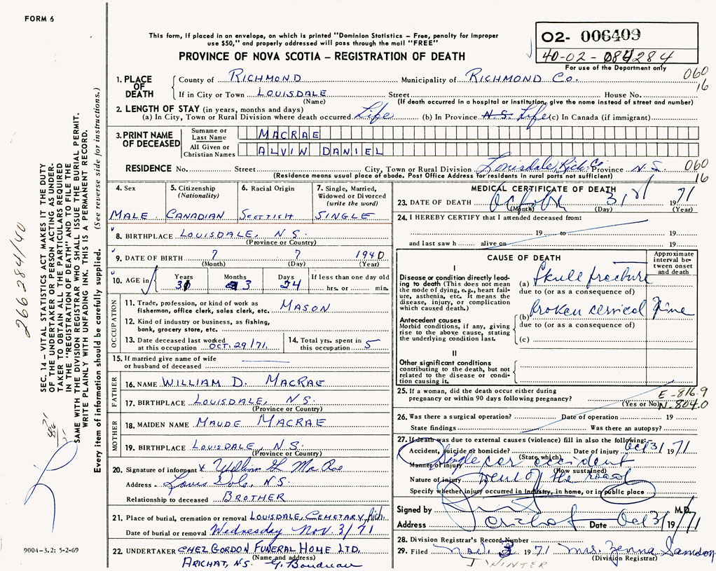 PROVINCE OF NOVA SCOTIA — REGISTRATION OF DEATH
