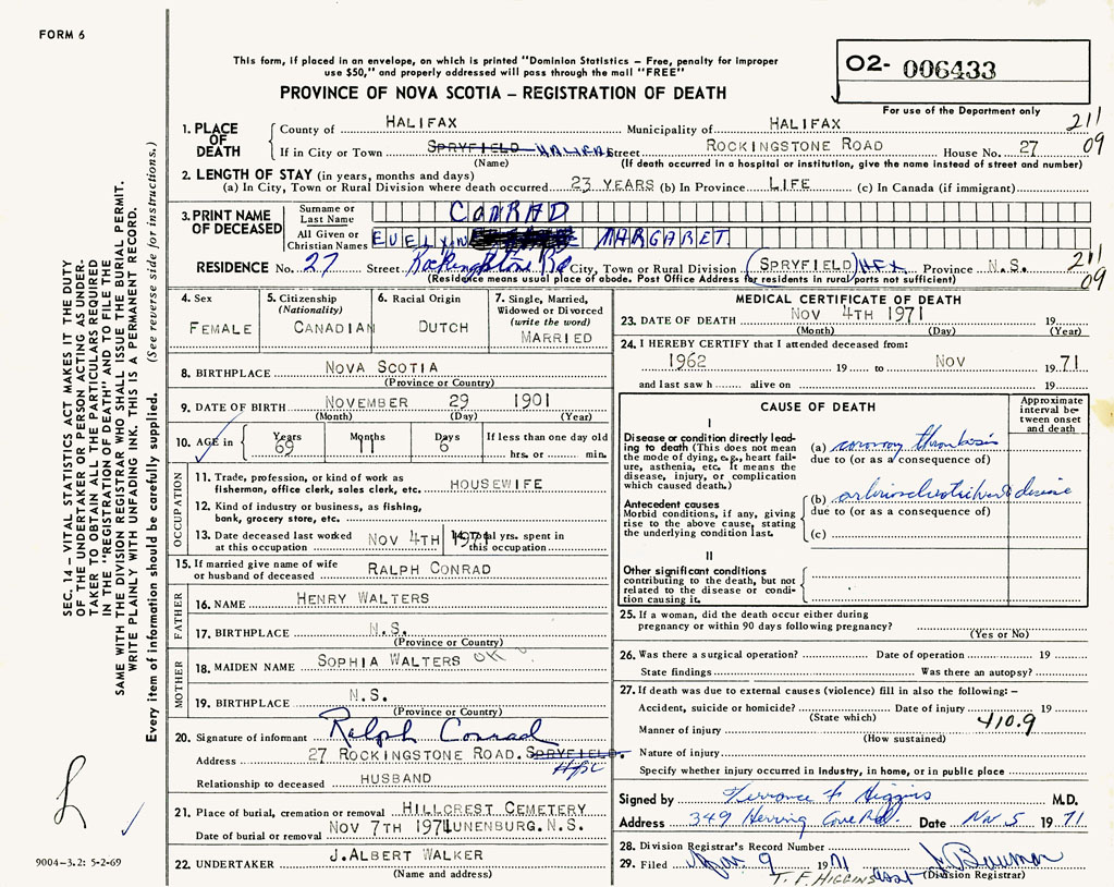 21. Place of burial Hillcrest Cemetery, Lunenburg