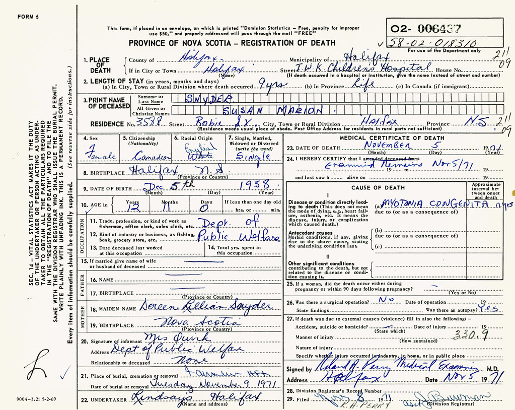 PROVINCE OF NOVA SCOTIA — REGISTRATION OF DEATH