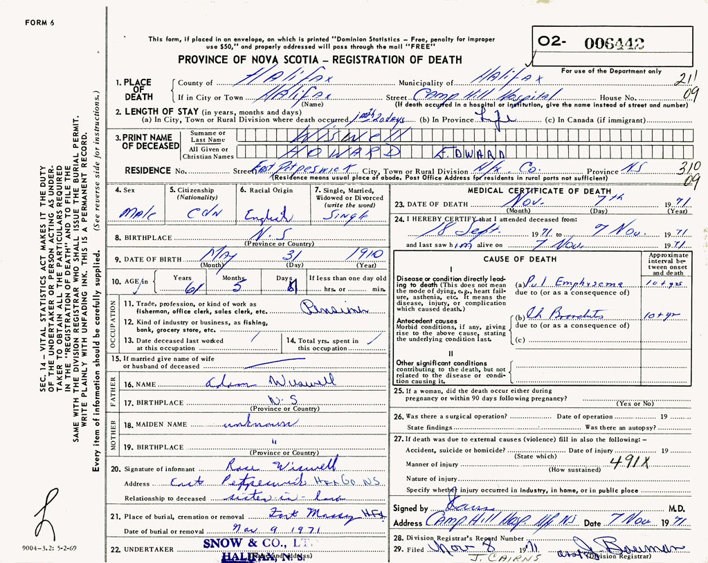 PROVINCE OF NOVA SCOTIA — REGISTRATION OF DEATH