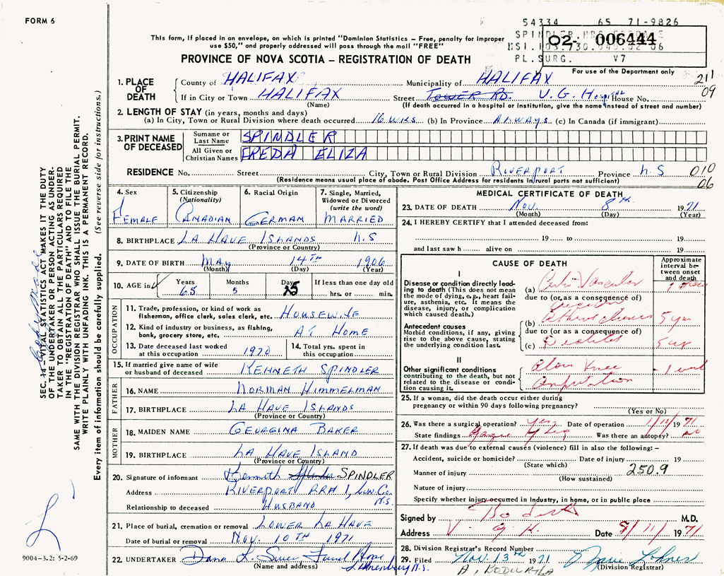 PROVINCE OF NOVA SCOTIA — REGISTRATION OF DEATH