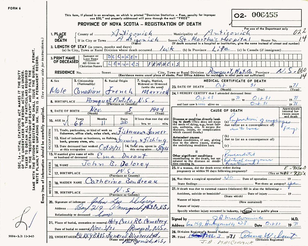 PROVINCE OF NOVA SCOTIA — REGISTRATION OF DEATH