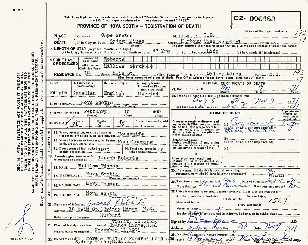 1. PLACE OF DEATH County of Cape Breton If in City or Town Sydney Mines