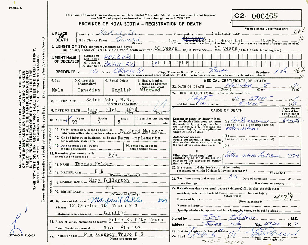 PROVINCE OF NOVA SCOTIA — REGISTRATION OF DEATH