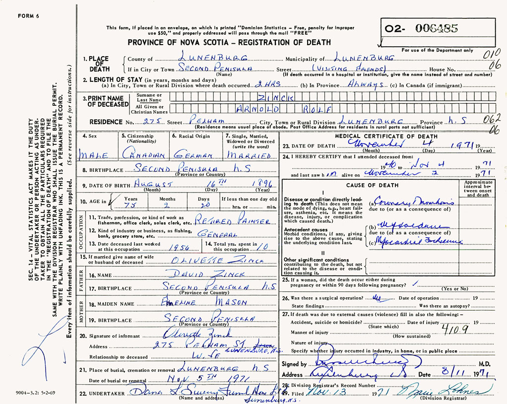 PROVINCE OF NOVA SCOTIA — REGISTRATION OF DEATH