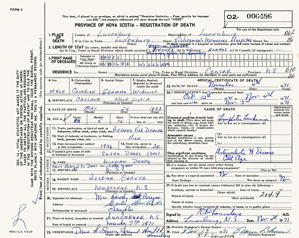 PROVINCE OF NOVA SCOTIA — REGISTRATION OF DEATH