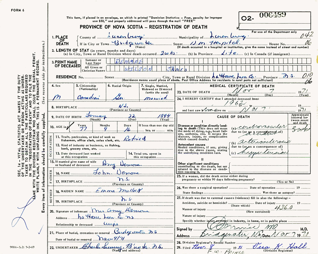 PROVINCE OF NOVA SCOTIA — REGISTRATION OF DEATH