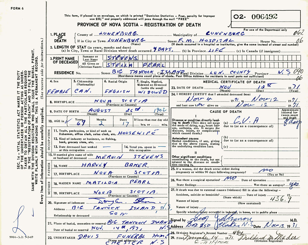 21. Place of burial Big Tancook Island