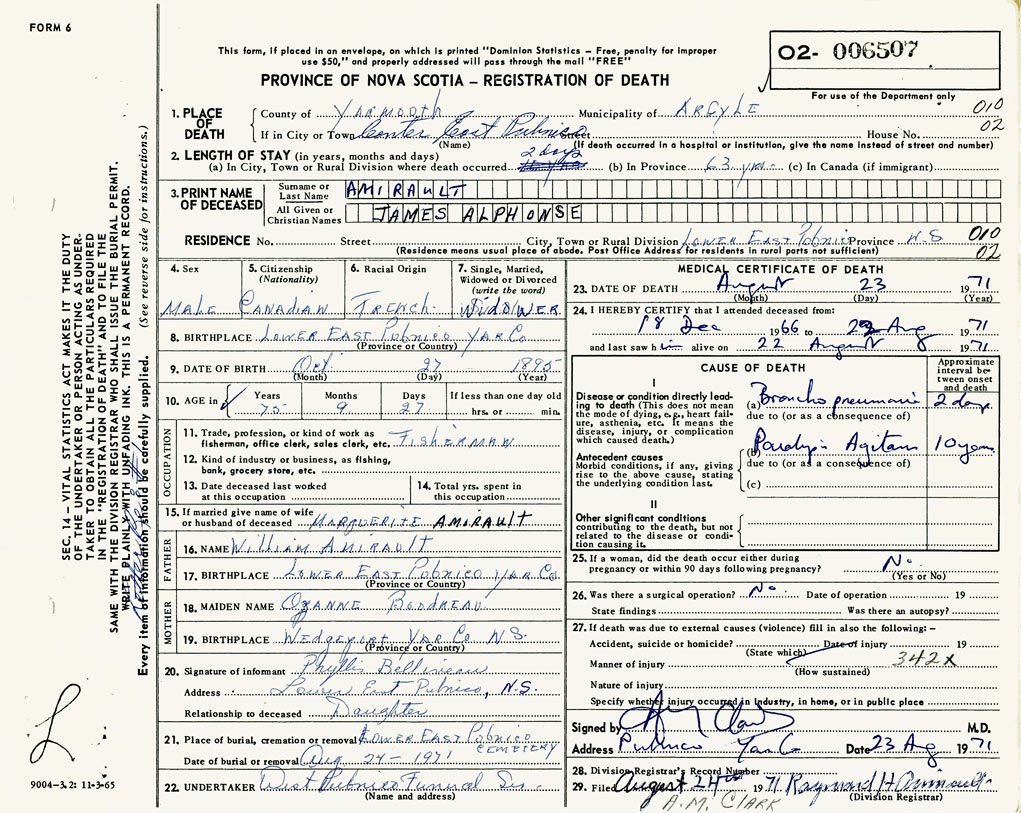 PROVINCE OF NOVA SCOTIA — REGISTRATION OF DEATH