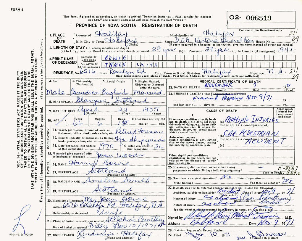 PROVINCE OF NOVA SCOTIA — REGISTRATION OF DEATH
