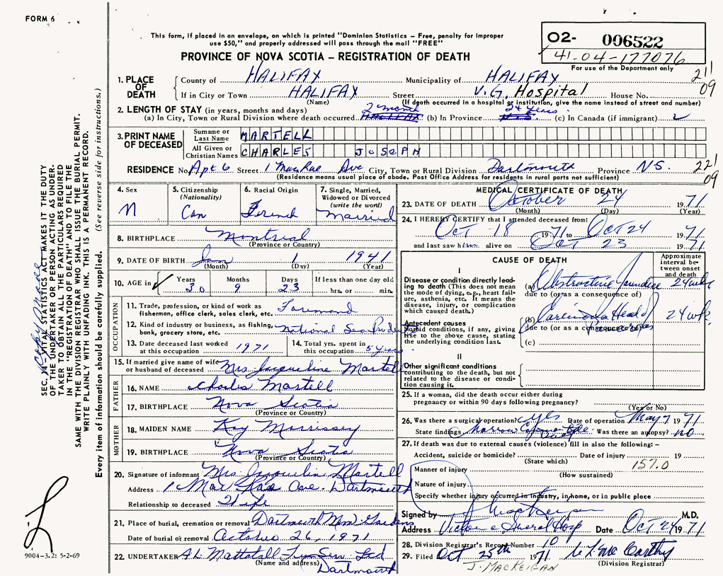 PROVINCE OF NOVA SCOTIA — REGISTRATION OF DEATH