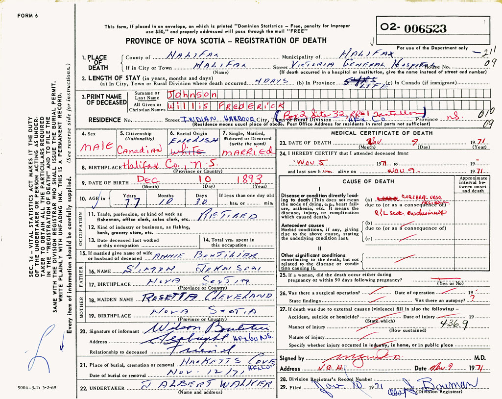 PROVINCE OF NOVA SCOTIA — REGISTRATION OF DEATH