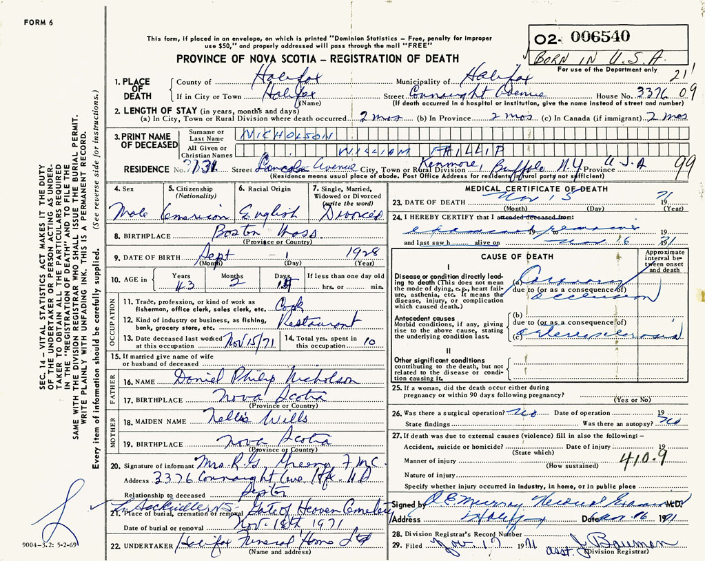 PROVINCE OF NOVA SCOTIA — REGISTRATION OF DEATH