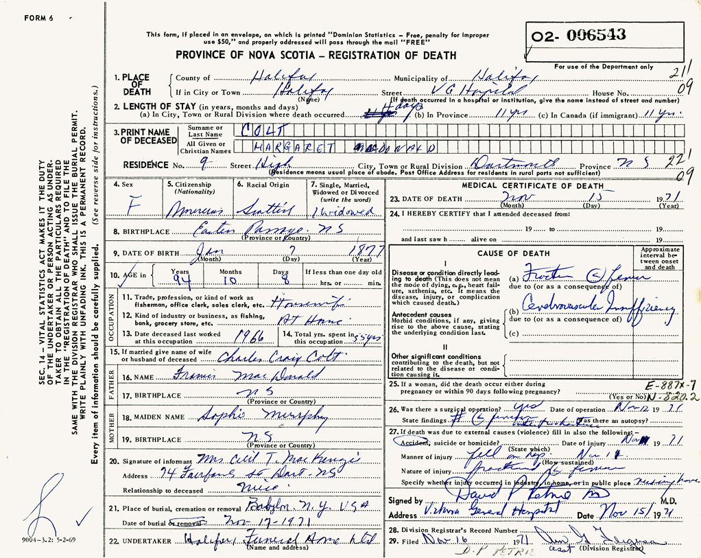 PROVINCE OF NOVA SCOTIA — REGISTRATION OF DEATH
