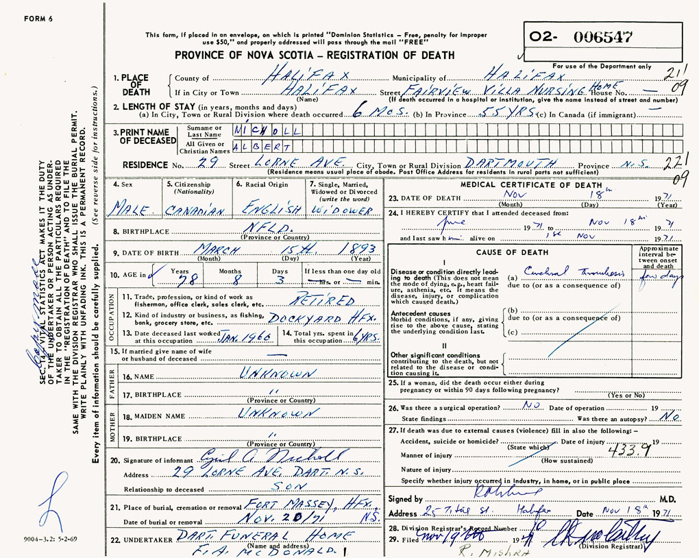 PROVINCE OF NOVA SCOTIA — REGISTRATION OF DEATH