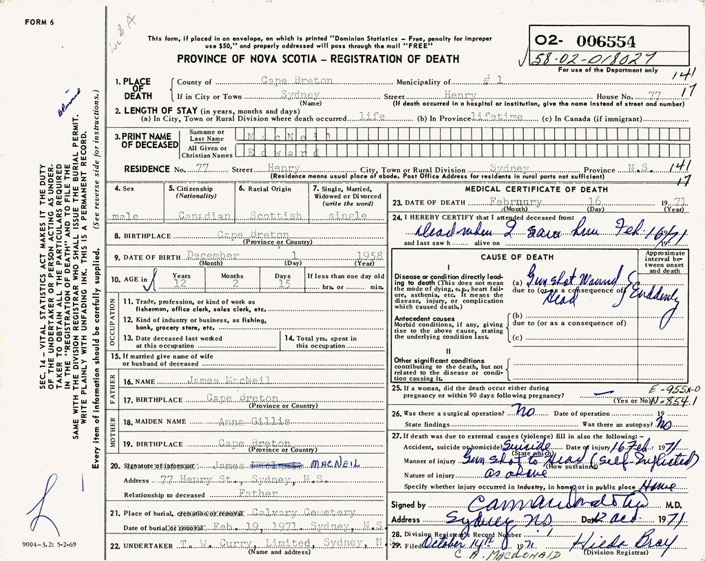 PROVINCE OF NOVA SCOTIA — REGISTRATION OF DEATH