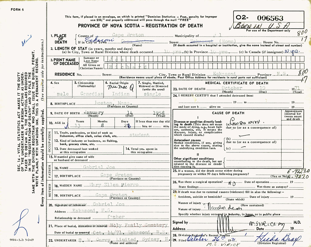 21. Place of burial Holy Family Cemetery, Eskasoni, N.S