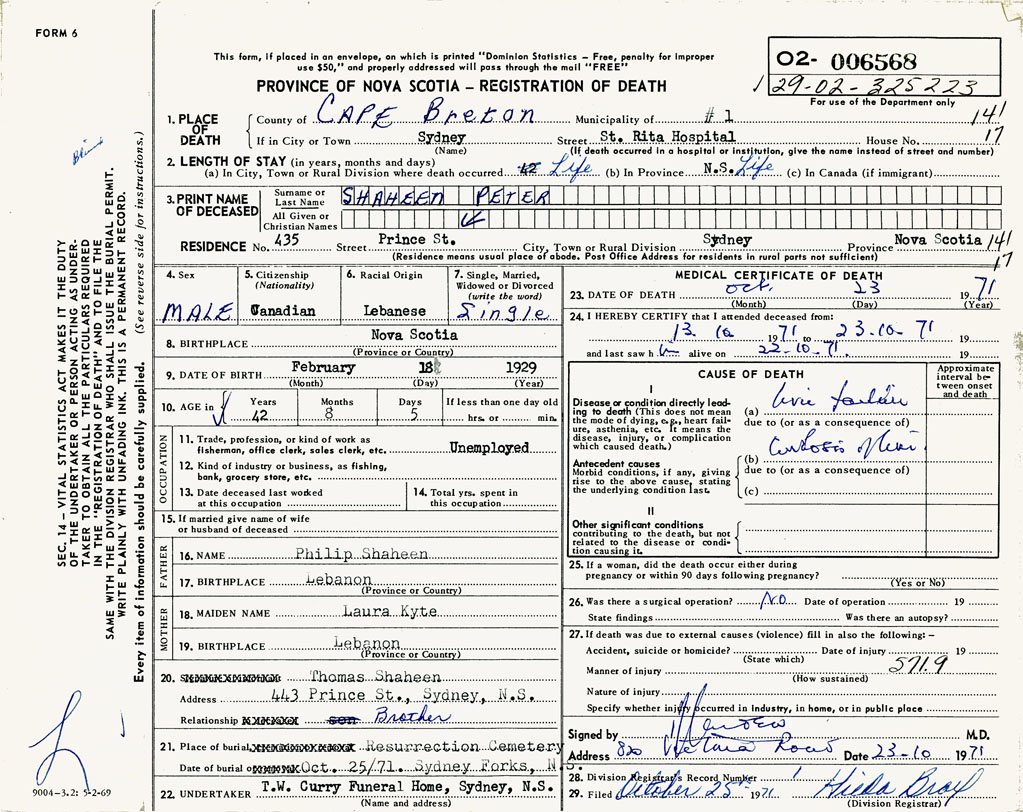 1. PLACE OF DEATH County of Cape Breton If in City or Town Sydney
