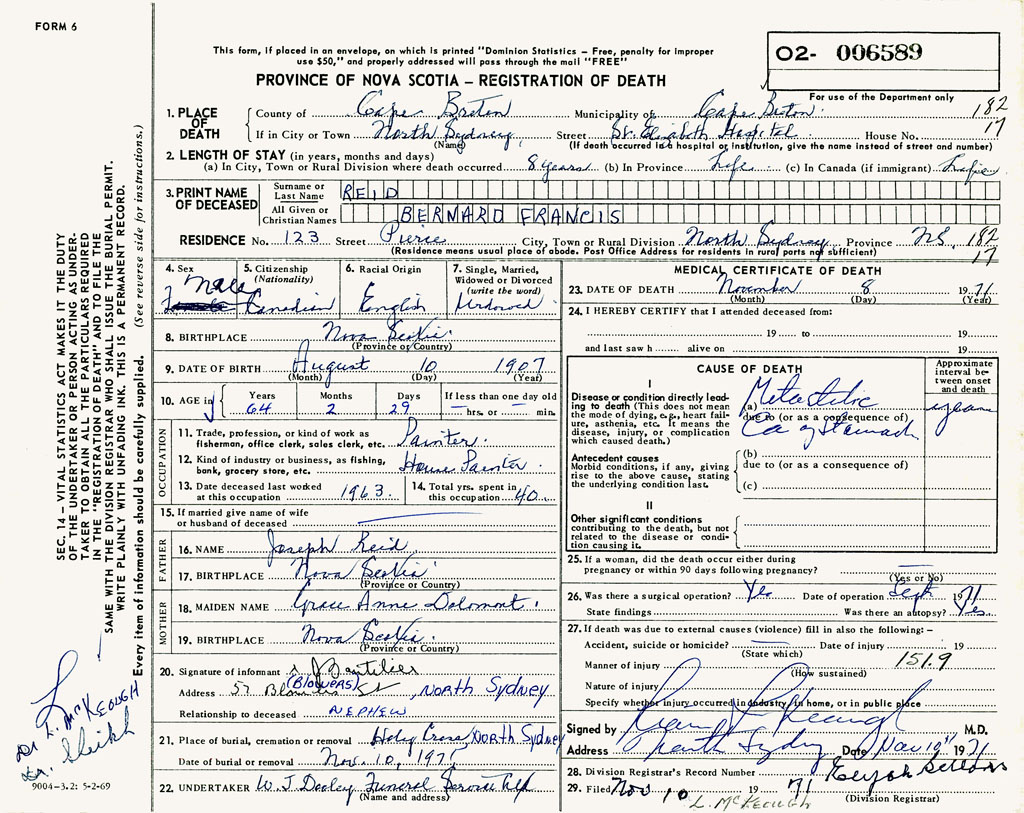 PROVINCE OF NOVA SCOTIA — REGISTRATION OF DEATH