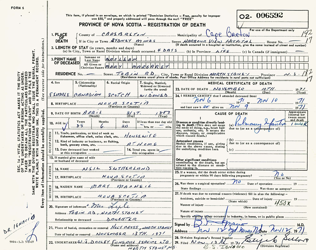 1. PLACE OF DEATH County of Cape Breton If in City or Town Sydney Mines
