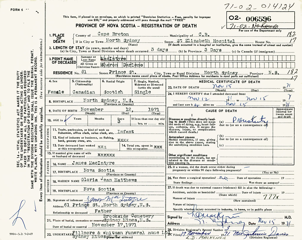 1. PLACE OF DEATH County of Cape Breton If in City or Town North Sydney