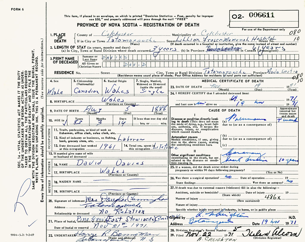 PROVINCE OF NOVA SCOTIA — REGISTRATION OF DEATH