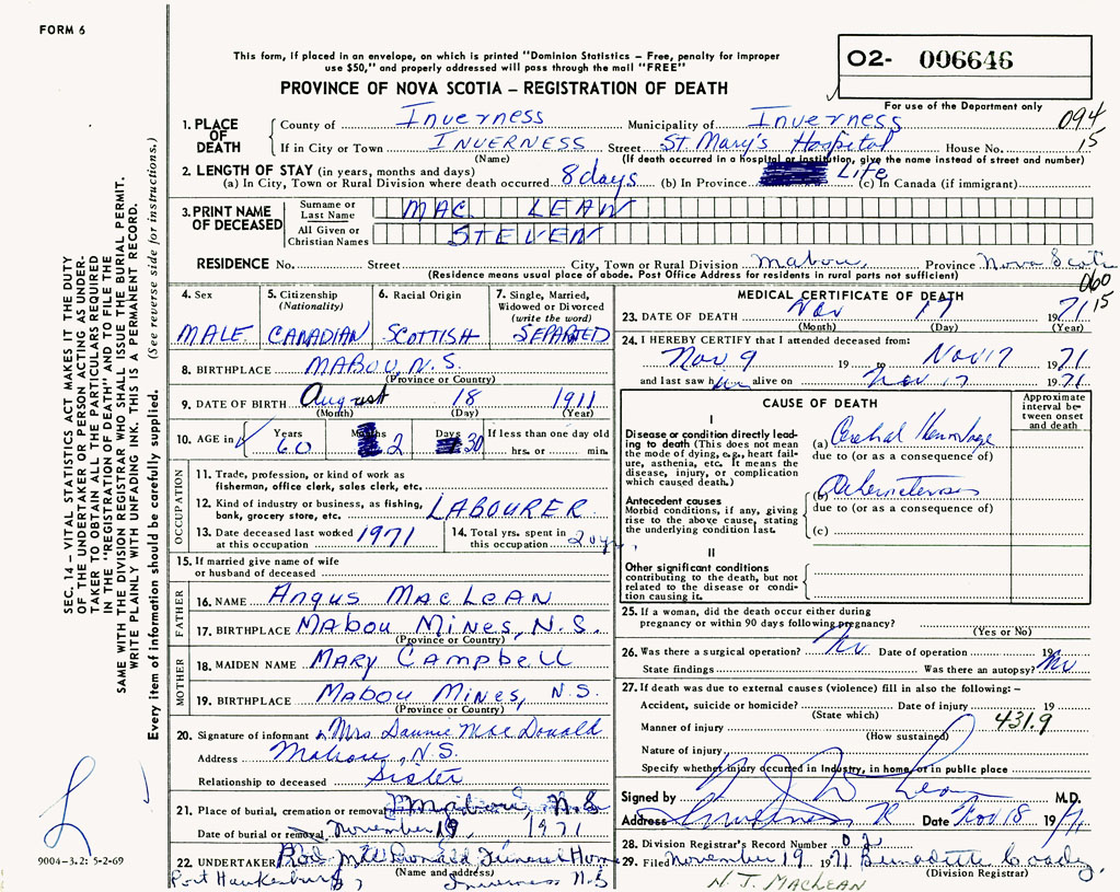 PROVINCE OF NOVA SCOTIA — REGISTRATION OF DEATH