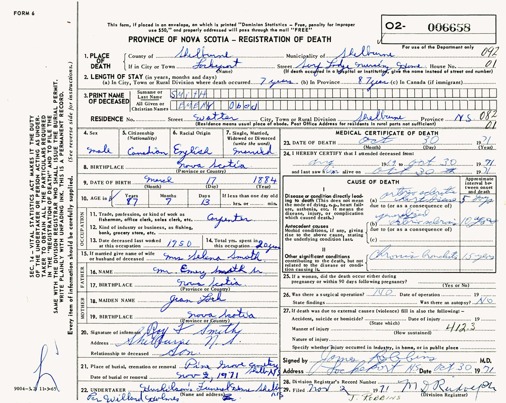 1. PLACE OF DEATH County of Shelburne If in City or Town Lockeport
