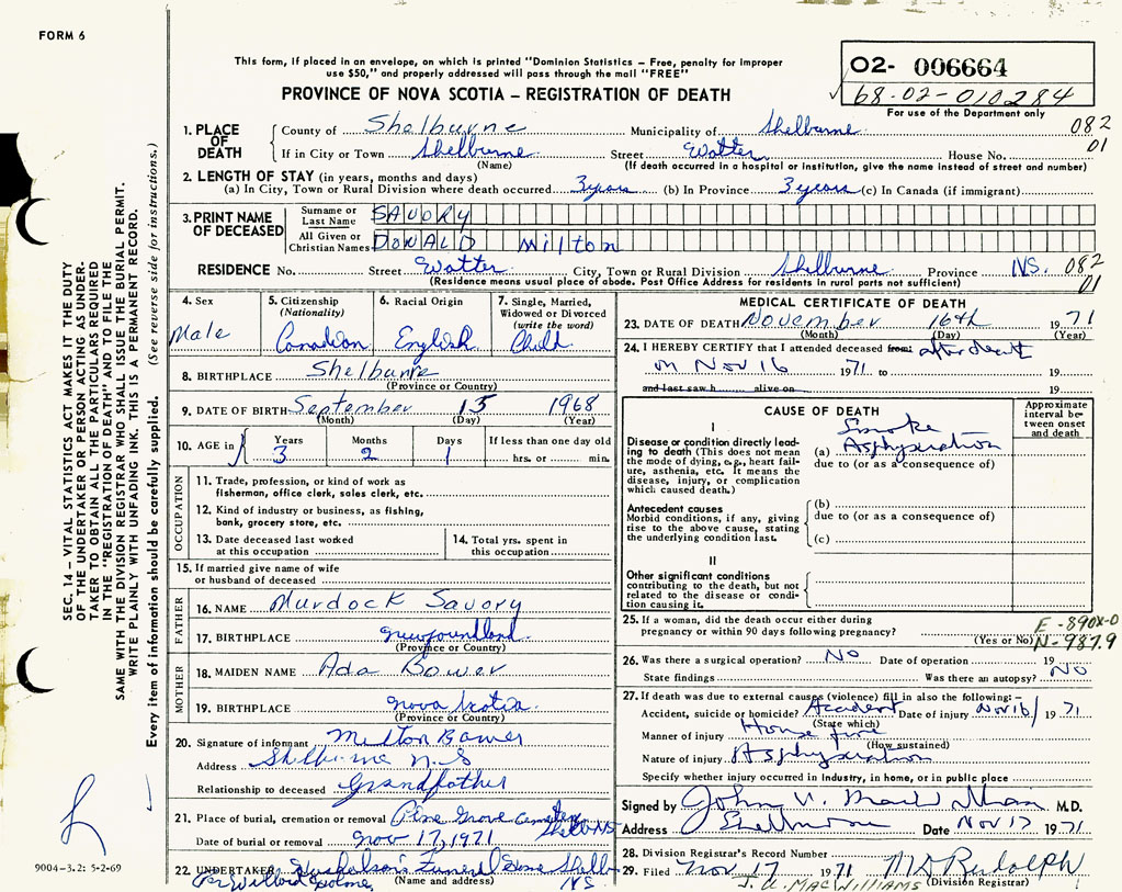 PROVINCE OF NOVA SCOTIA — REGISTRATION OF DEATH