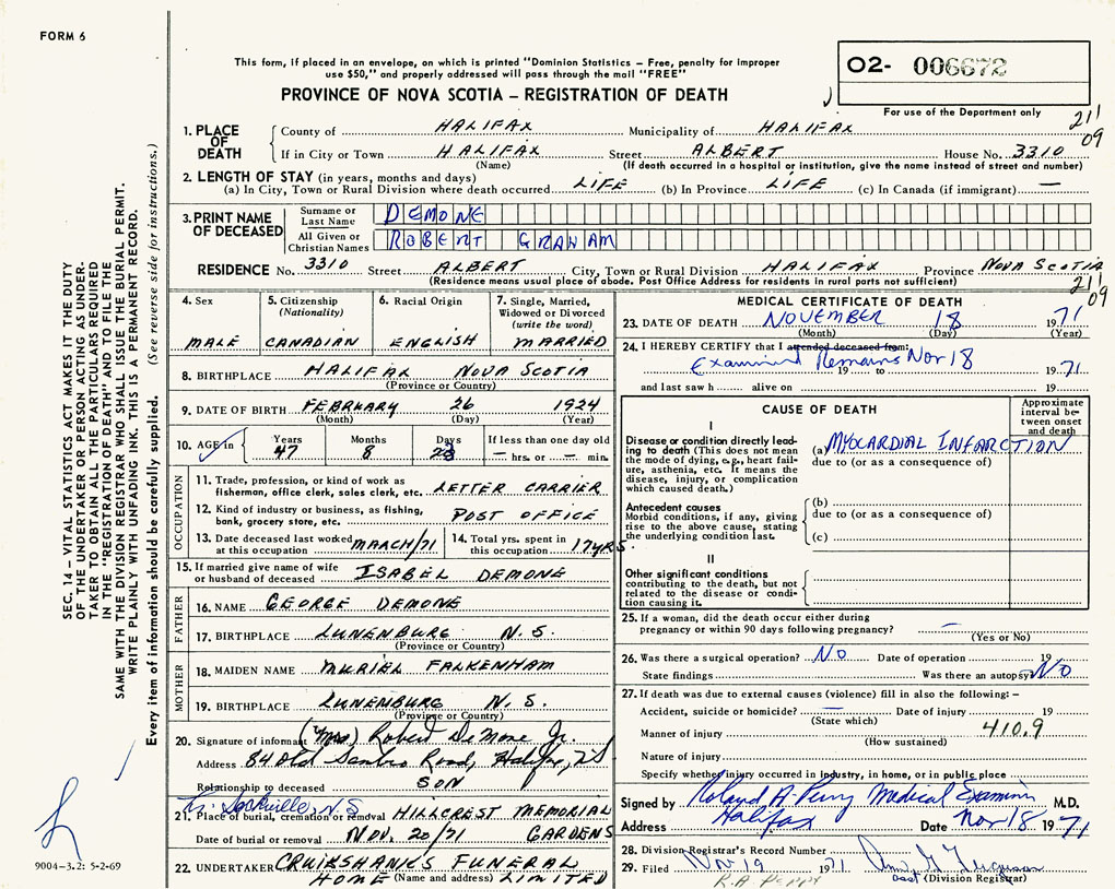 PROVINCE OF NOVA SCOTIA — REGISTRATION OF DEATH