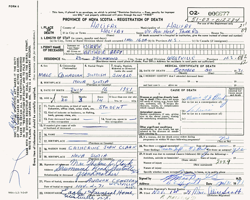 PROVINCE OF NOVA SCOTIA — REGISTRATION OF DEATH