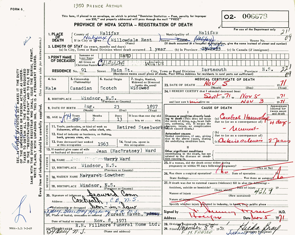 PROVINCE OF NOVA SCOTIA — REGISTRATION OF DEATH