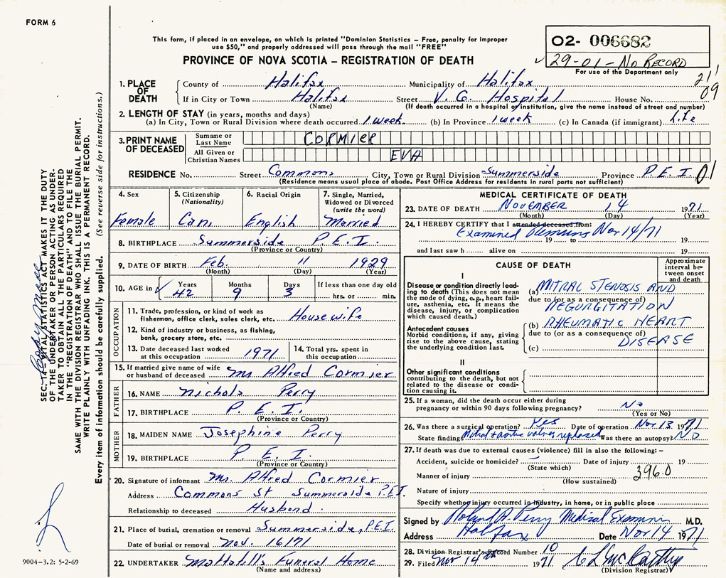 PROVINCE OF NOVA SCOTIA — REGISTRATION OF DEATH