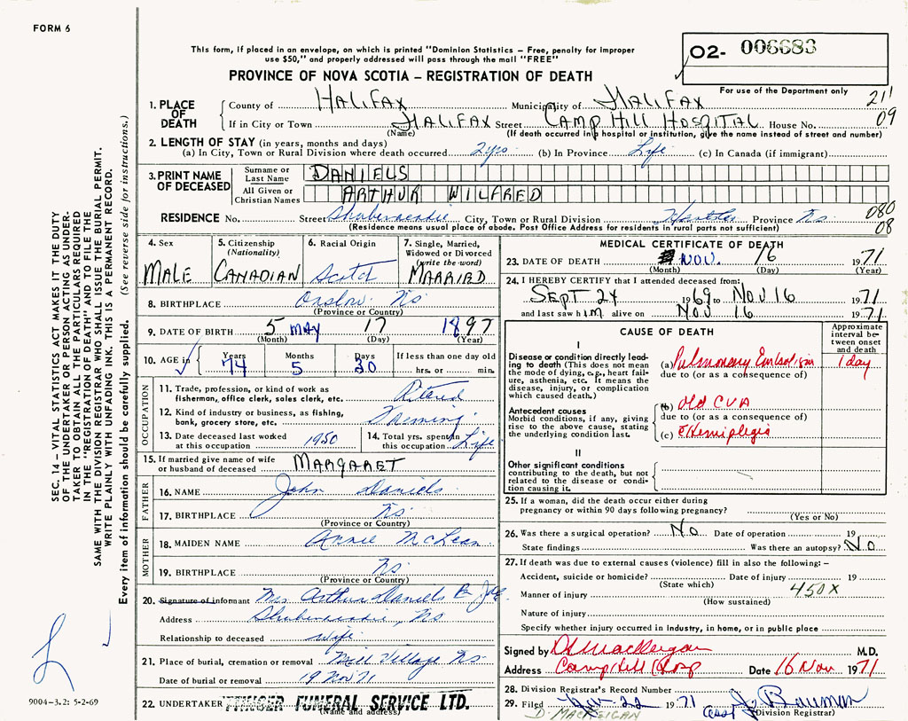 PROVINCE OF NOVA SCOTIA — REGISTRATION OF DEATH