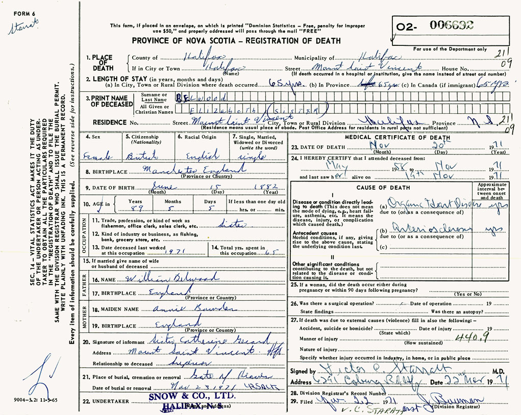 PROVINCE OF NOVA SCOTIA — REGISTRATION OF DEATH