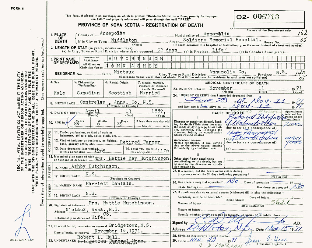 PROVINCE OF NOVA SCOTIA — REGISTRATION OF DEATH