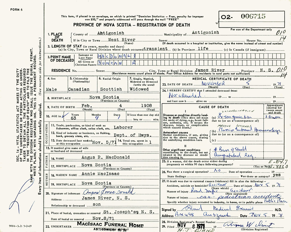 PROVINCE OF NOVA SCOTIA — REGISTRATION OF DEATH