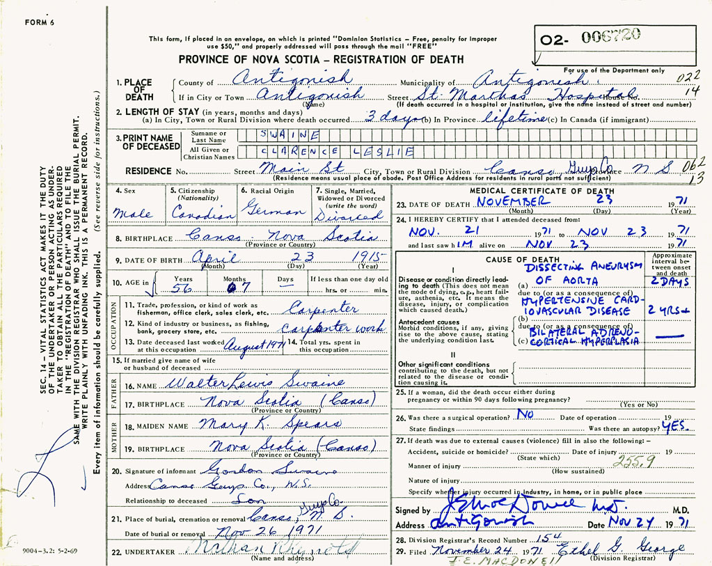 PROVINCE OF NOVA SCOTIA — REGISTRATION OF DEATH