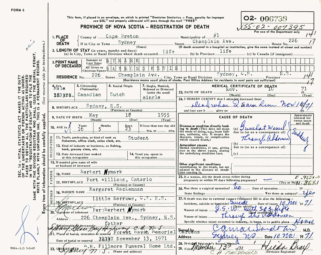 PROVINCE OF NOVA SCOTIA — REGISTRATION OF DEATH