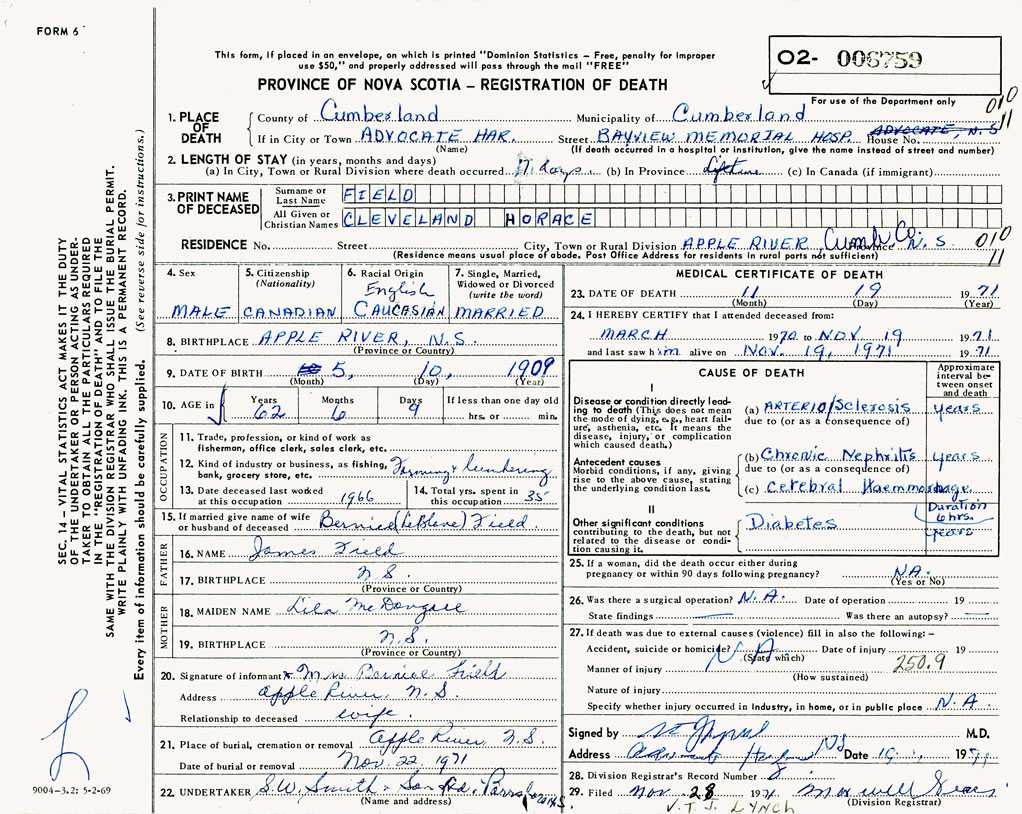 1. PLACE OF DEATH County of Cumberland If in City or Town Advocate Harbour