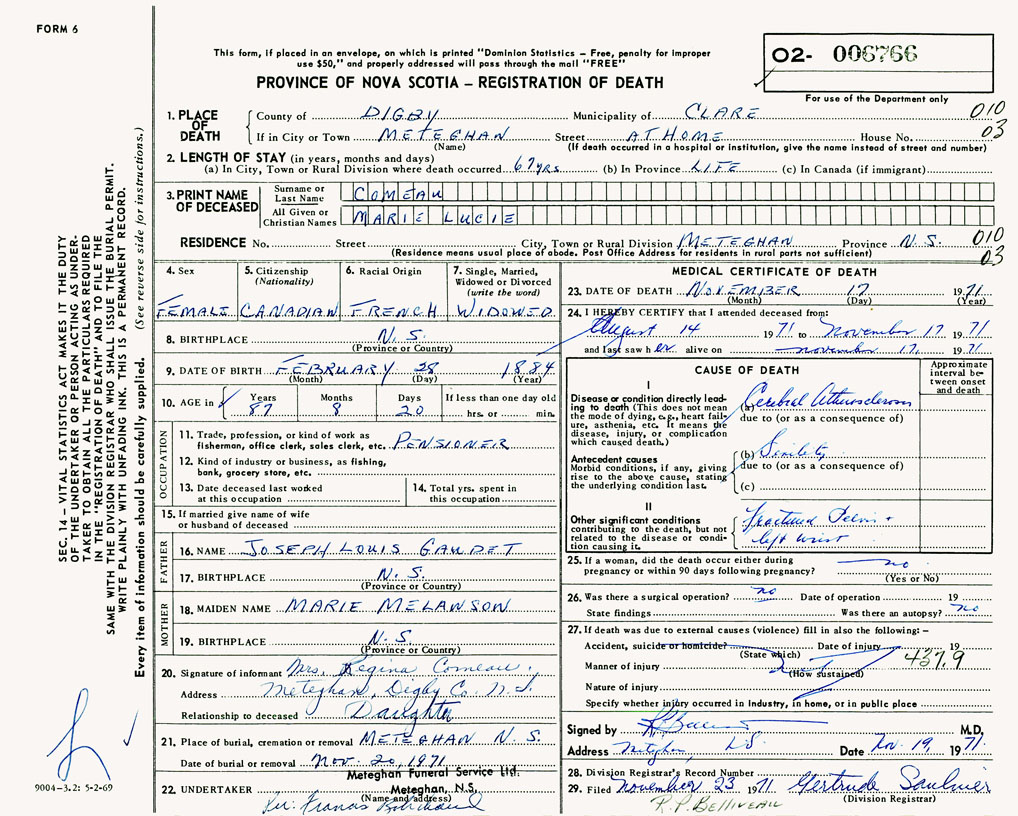 21. Place of burial Meteghan, NS