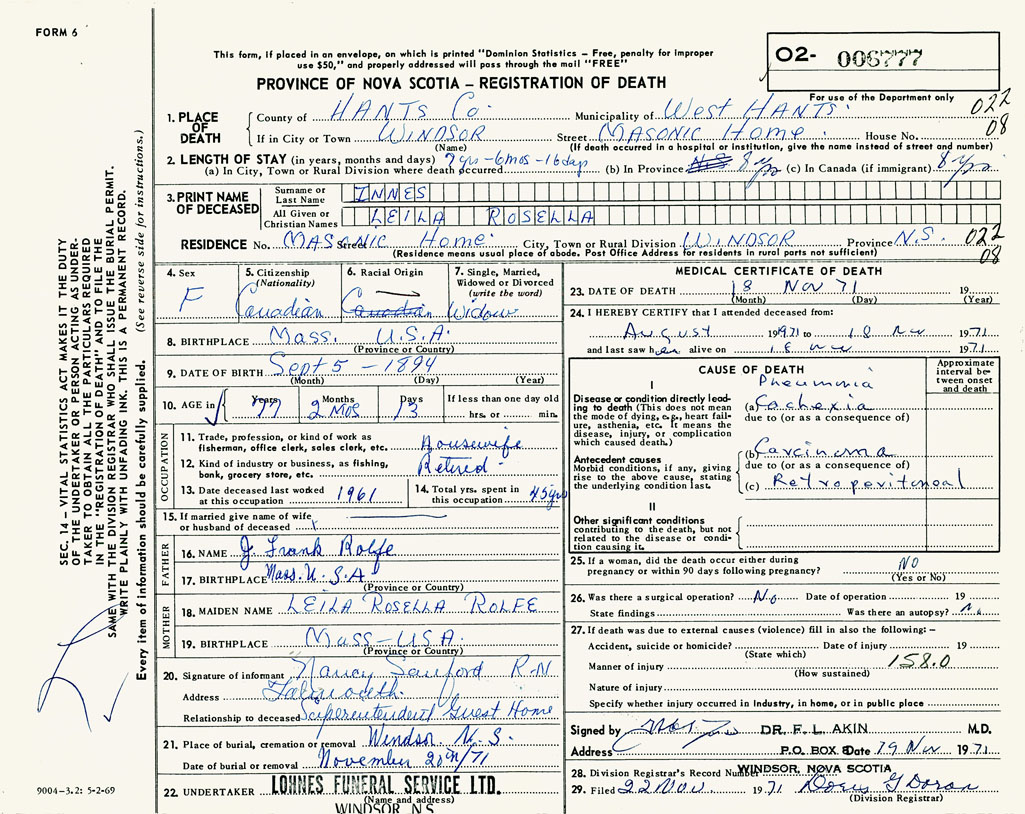PROVINCE OF NOVA SCOTIA — REGISTRATION OF DEATH