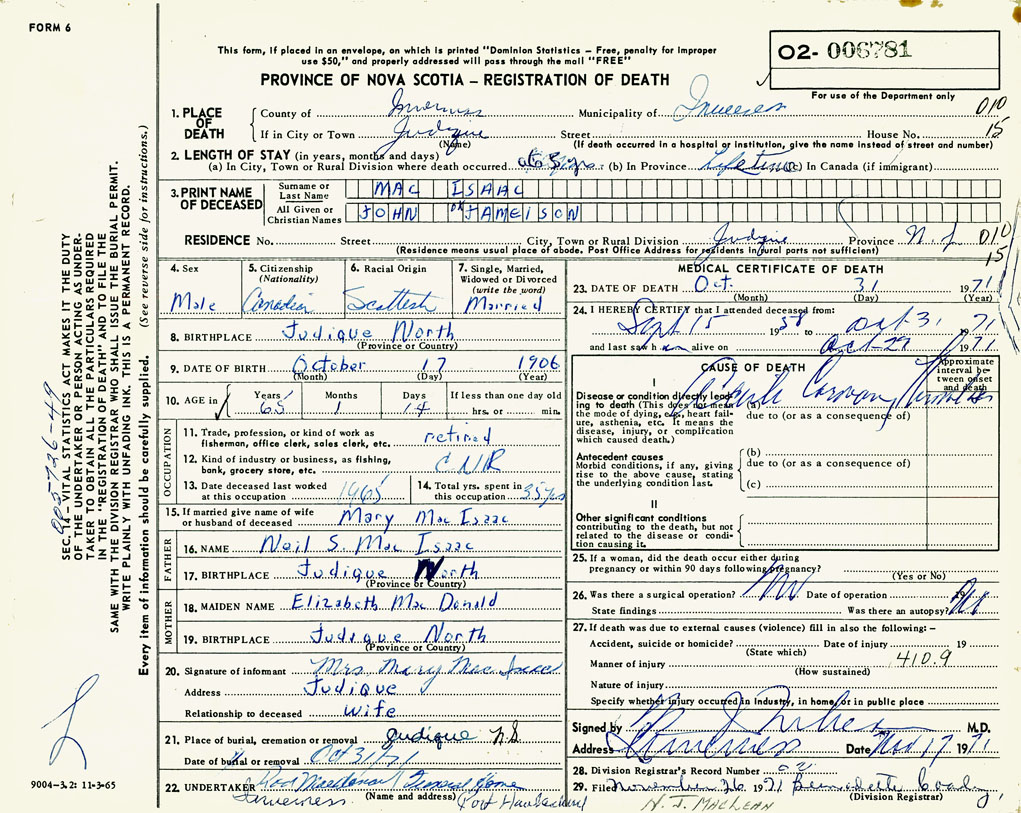 1. PLACE OF DEATH County of Inverness If in City or Town Judique