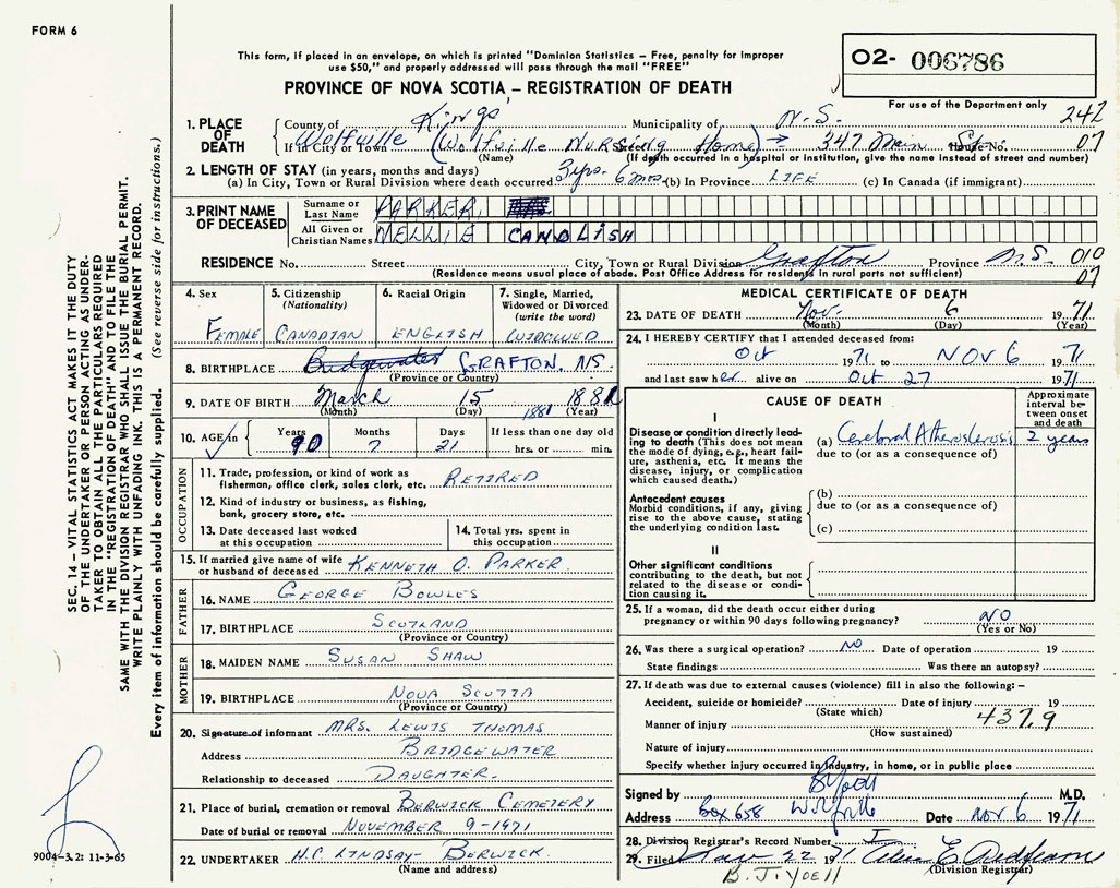 PROVINCE OF NOVA SCOTIA — REGISTRATION OF DEATH