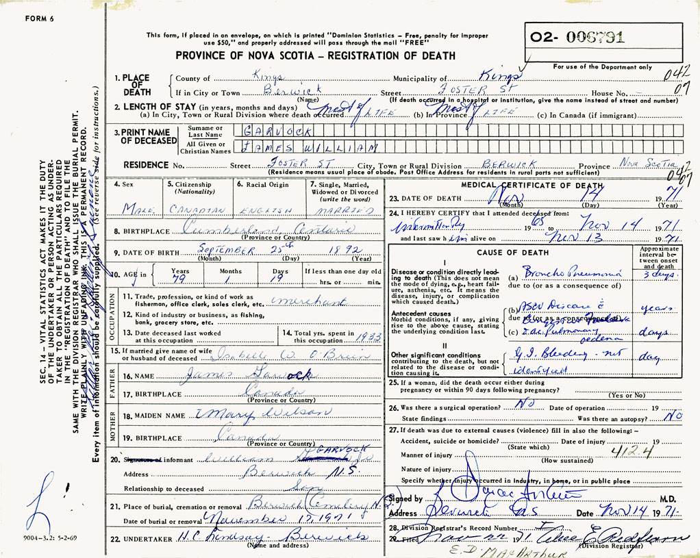 PROVINCE OF NOVA SCOTIA — REGISTRATION OF DEATH