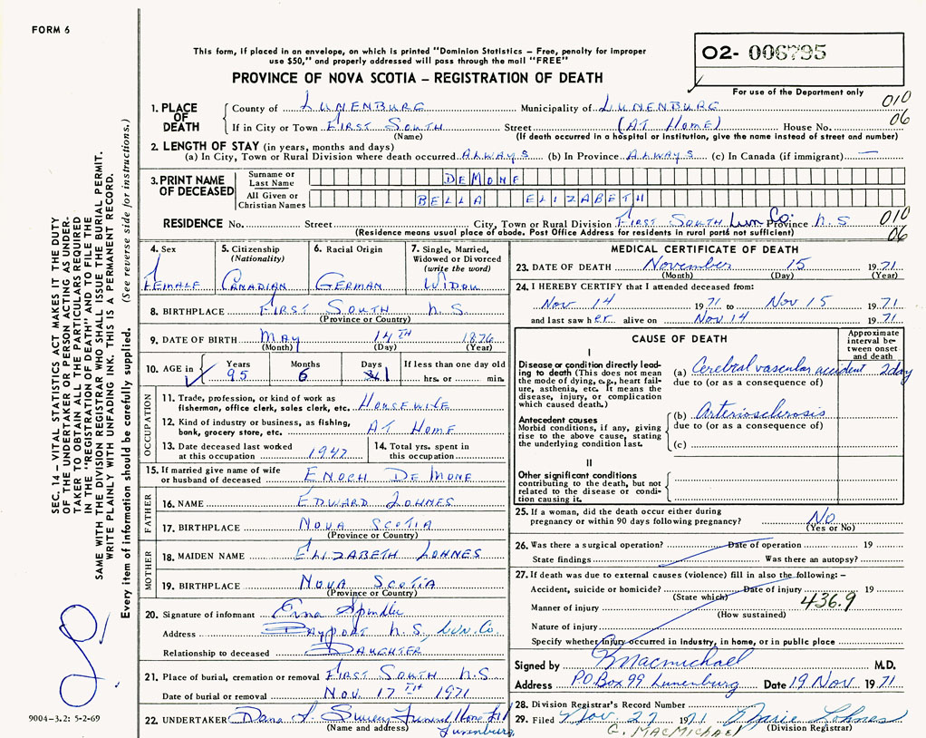 PROVINCE OF NOVA SCOTIA — REGISTRATION OF DEATH