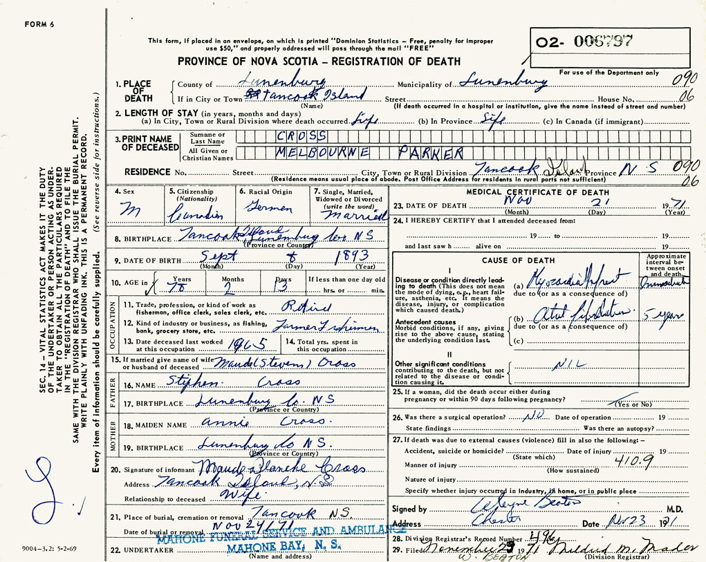 1. PLACE OF DEATH County of Lunenburg If in City or Town Tancook Island