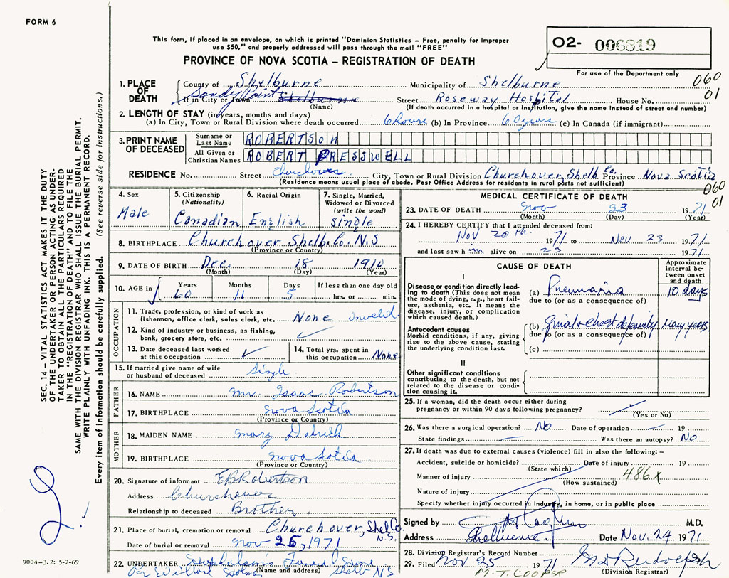 PROVINCE OF NOVA SCOTIA — REGISTRATION OF DEATH