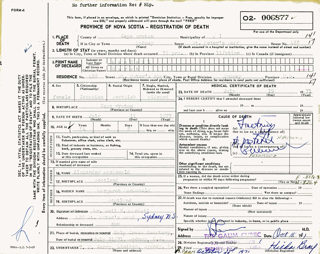 1. PLACE OF DEATH County of Cape Breton If in City or Town Sydney