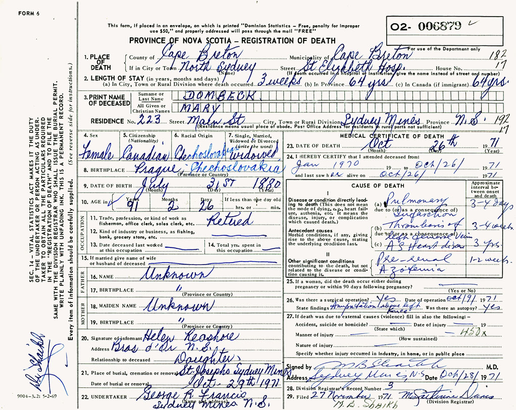1. PLACE OF DEATH County of Cape Breton If in City or Town North Sydney
